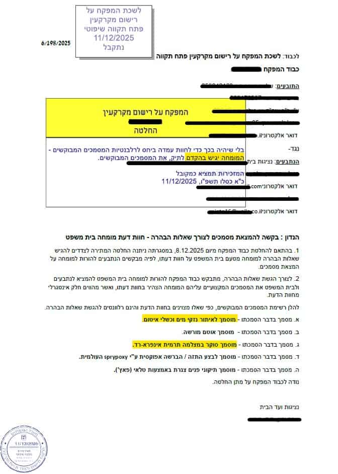במסגרת הליך שהתנהל בפני המפקח על רישום מקרקעין בפתח תקווה, נדרשו הצדדים להגיש שאלות הבהרה למומחה מטעם בית המשפט. כחלק מההליך, הוגשה בקשה רשמית להמצאת מסמכים המעידים על הכשרתו והסמכתו המקצועית של המומחה.